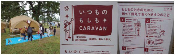 また、地元直江津では、無印良品が行っている「いつものもしも★CARAVAN」。毎年、海浜公園(通称「たこ公園」)で開催されている防災体験イベントです。当日はあいにくの空模様でしたが、直江津屋台会館を使って心臓マッサージの実演や、実際に災害時に使われる段ボールベッドの展示などが行われていました。