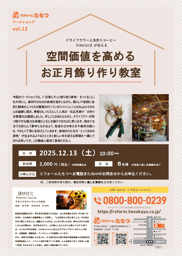 12月13日(土)空間価値を高めるお正月飾り作り教室(ワークショップ) 開催!